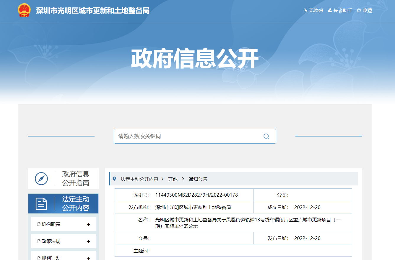 12月20日,光明区城市更新和土地整备局发布关于凤凰街道轨道13号线车辆段片区重点城市更新项目(一期)实施主体的公示。光明区凤凰街道轨道13号线车辆段片区重点城市更新项...