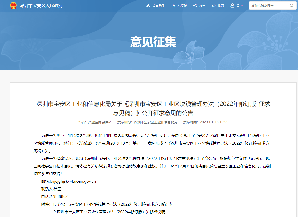 深圳市宝安区工业区块线管理办法(2022年修订版-征求意见稿)发布