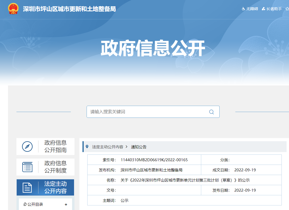 9月19日,2022年深圳市坪山区城市更新单元计划第三批计划(草案)公示:分别为龙坪山街道新和村片区城市更新单元,坑梓街道秀新路片区城市更新单元、龙田街道天俊工业园城市...