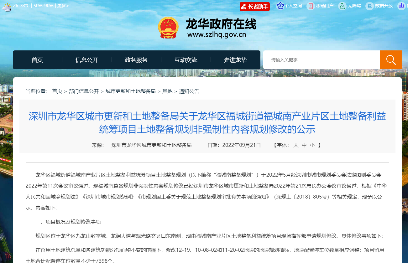 深圳市龙华区城市更新和土地整备局发布关于龙华区福城街道福城南产业片区土地整备利益统筹项目土地整备规划非强制性内容规划修改的公示龙华区福城街道福城南产业片区土地整...