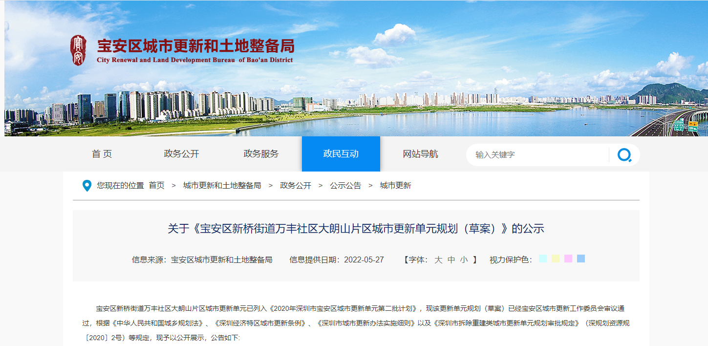 宝安区新桥街道万丰社区大朗山片区城市更新单元已列入《2020年深圳市宝安区城市更新单元第二批计划》,现该更新单元规划(草案)已经宝安区城市更新工作委员会审议通过,...
