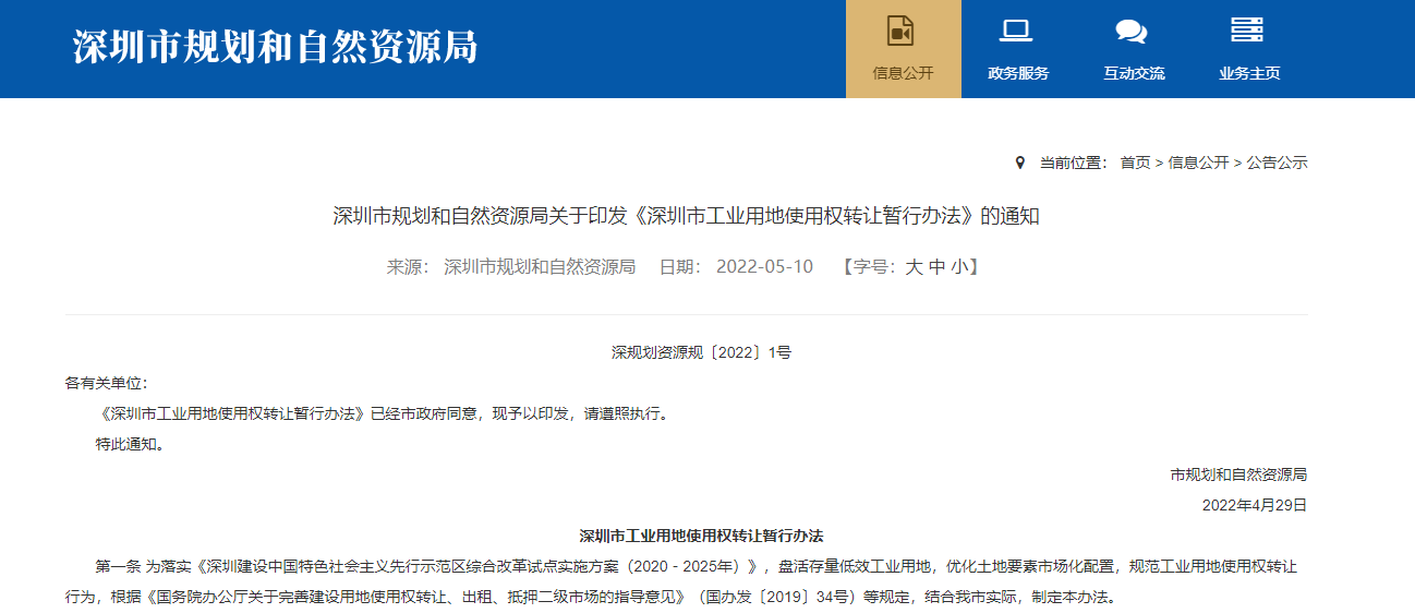 《深圳市工业用地使用权转让暂行办法》出炉