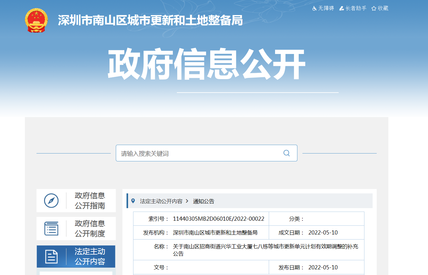 5月10日,南山城市更新和土地整备局发布了关于南山区招商街道兴华工业大厦七八栋等城市更新单元计划有效期调整的补充公告。南山区招商街道兴华工业大厦七八栋城市更新单元、...