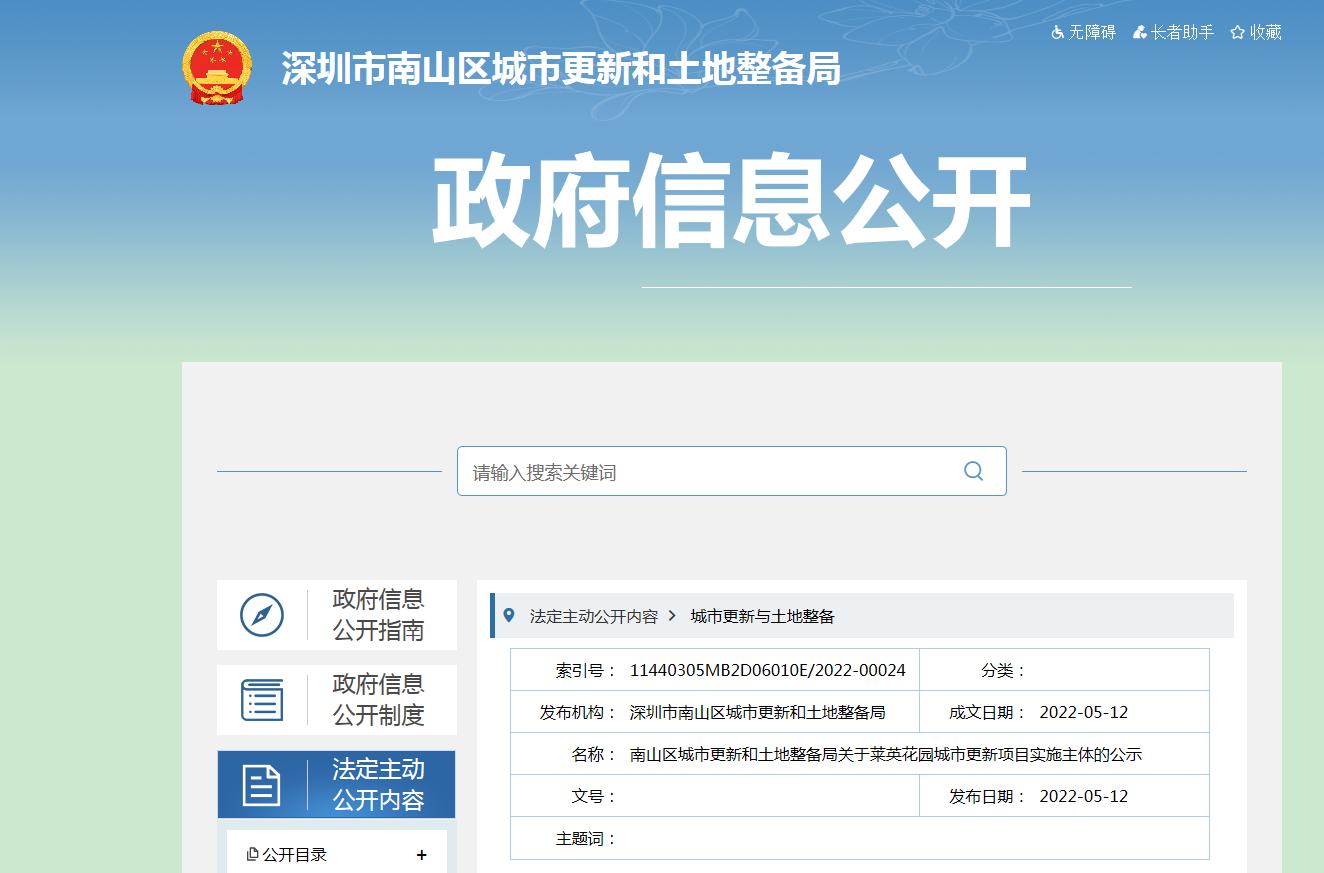 5月12日,深圳市南山区城市更新和土地整备局发布关于莱英花园城市更新项目实施主体的公示。 一、项目概况 莱英花园城市更新单元位于南山区粤海街道,东邻沙河西路、西邻...