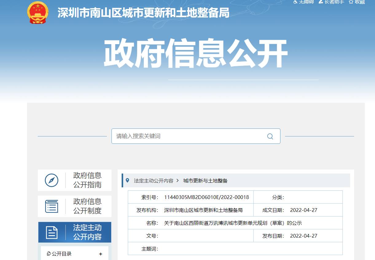 4月27日,深圳市南山区城市更新和土地整备局发布关于南山区西丽街道万讯博讯城市更新单元规划(草案)的公示。 南山区西丽街道万讯博讯城市更新单元已列入《2017年深圳市南...