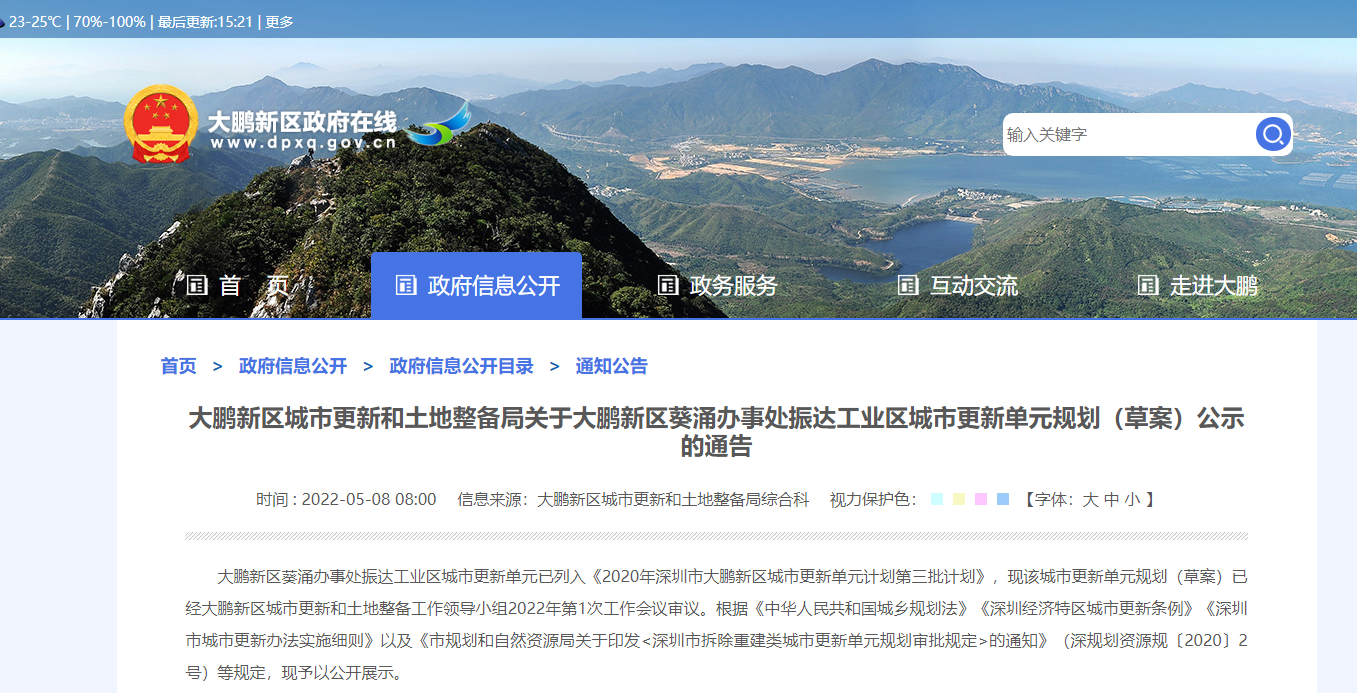 大鹏新区葵涌办事处振达工业区城市更新单元已列入《2020年深圳市大鹏新区城市更新单元计划第三批计划》,现该城市更新单元规划(草案)已经大鹏新区城市更新和土地整备工...