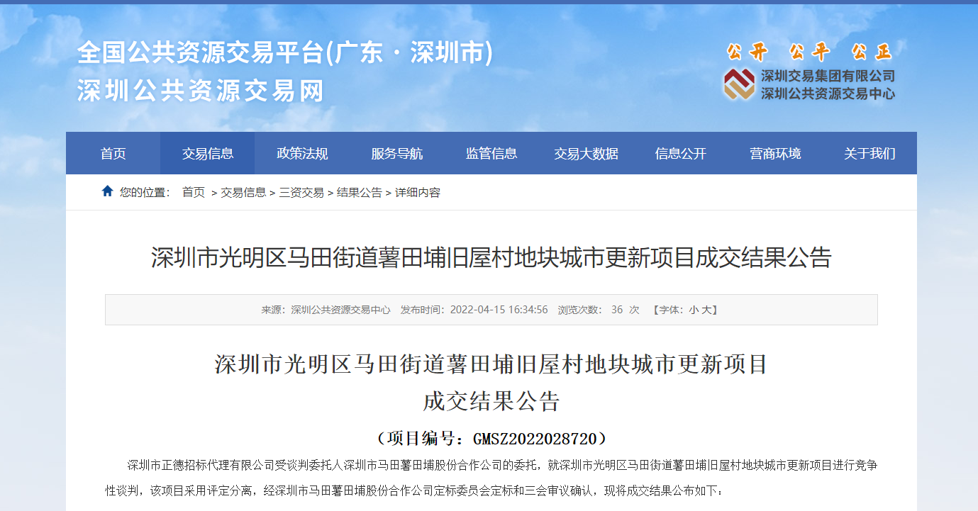 4月15日,深圳公共资源交易平台发布深圳市光明区马田街道薯田埔旧屋村地块城市更新项目成交结果公告成交人简介:成交人为深圳市锦业实业发展有限公司。查询工商信息显示,深...