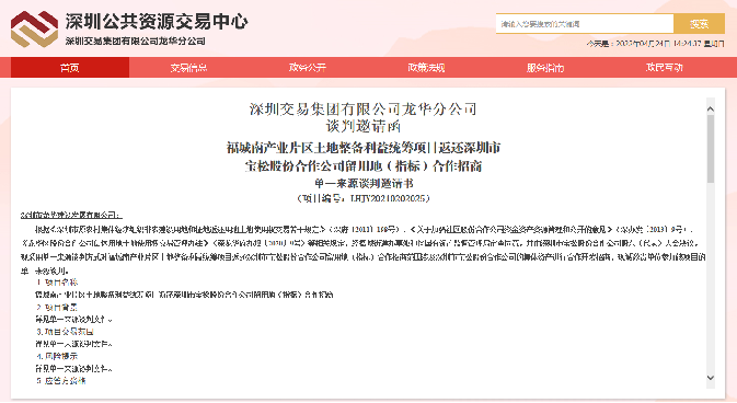 4月24日,深圳公共资源交易中心发布关于福城南产业片区土地整备利益统筹项目返还深圳市宝松股份合作公司留用地(指标)合作招商单一来源谈判邀请书。采用单一来源谈判方式对...