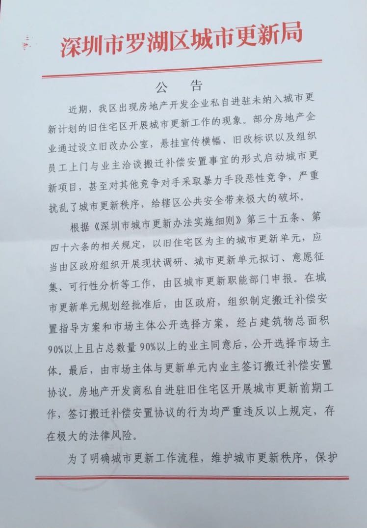 针对近期又有开发商进驻旧小区开展城市更新前期工作,甚至对其他竞争手段采取暴力手段。罗湖区城市更新局发布公告,重申开发商不得进驻旧住宅区开展城市更新的前期工作。网...