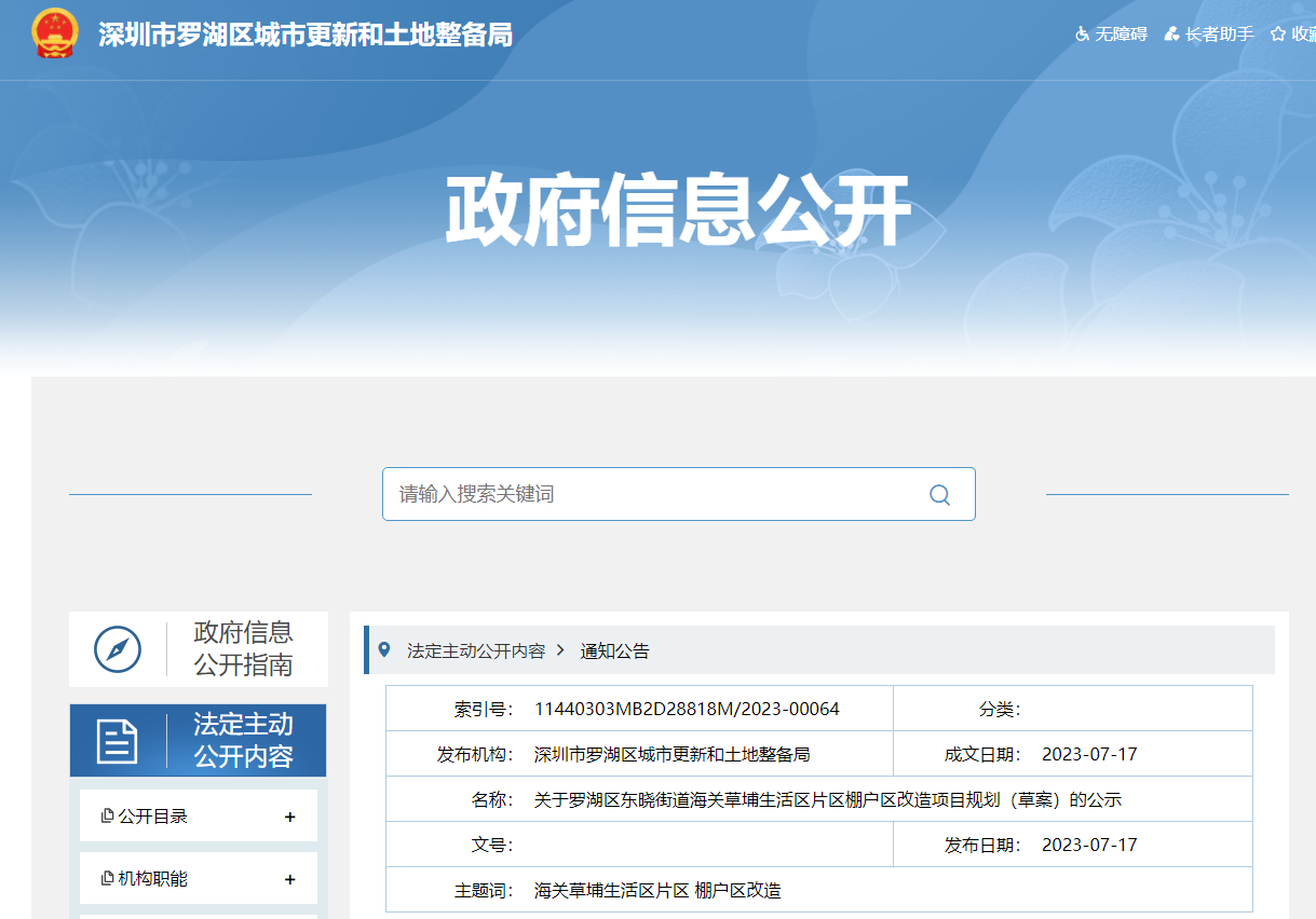 7月17日,罗湖区城市更新和土地整备局发布关于罗湖区东晓街道海关草埔生活区片区棚户区改造项目规划(草案)的公示罗湖区东晓街道海关草埔生活区片区棚户区改造项目被列入《...