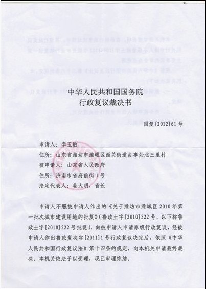 国务院行政复议裁决书推翻山东省政府征地有关决定两年之后,清华大学法学博士王进文的法律维权之路终于看到一线曙光。今年3月,山东省认定他家所在区域征地合法决定的裁决...