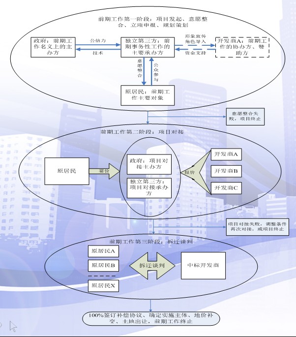 此时的第三方服务机构不再是开发商的附属,不再是完全站在开发商的立场替开发商出谋划策,帮开发商规避风险,帮开发商谋取利润的最大化。此时,独立第三方服务机构的任务是站在公正立场上,促成政府、开发商、原业主三方合作伙伴关系的建立,促成他们三方之间交易的达成。在此三位一体运作模式中,独立第三方服务机构运用自己在城市更新法律法规、流程、规划、评估等方面的专业优势,是城市更新前期工作主要的承担者,政府部门是这些工作名义上的主办方,而开发商这时退居幕后,主要以工作的协办方或赞助方的面目出现。简单来说,前期工作中,政府部门是主办方,第三方服务机构是承办方,开发商是赞助方。政府部门为前期工作提供公信力,第三方服务机构提供专业知识,在不违背独立性原则的情况下,为开发商的形象宣传和角色导入提供便利。开发商以咨询服务费的形式为前期工作提供经费支持。在项目对接阶段,通过公开遴选准实施主体的制度设计,尽量促成前期介入的开发商通过竞标成为准实施主体。如未成为准实施主体,则通过制度设计,向中标的开发商收取咨询服务费返还给前期介入的开发商。运作流程图如下: