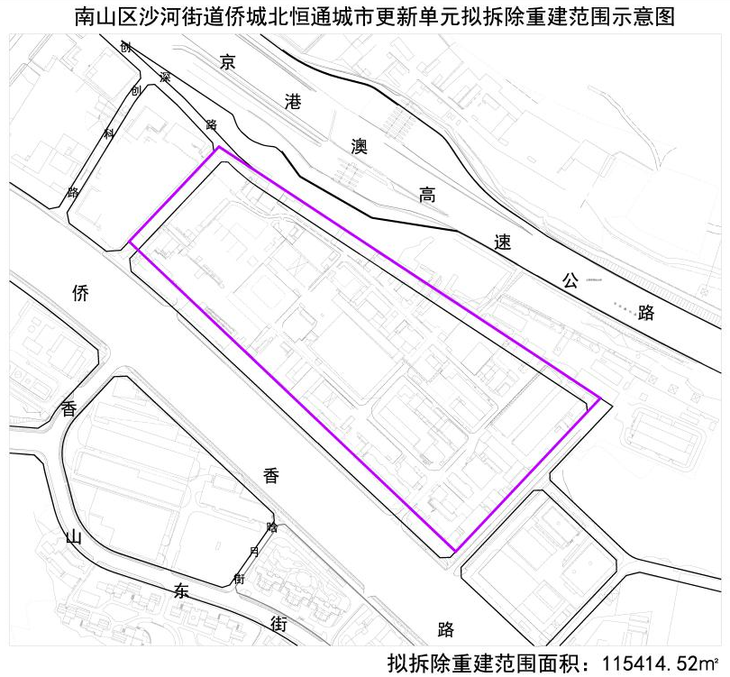 1 | 南山区 | 沙河街道 | 侨城北恒通城市更新单元 | 深圳市恒通实业发展有限公司 | 115414.52平方米 | ① 拟更新方向为新型产业用地、保障性住房用地、适量普通工业用地等功能。 ② 拟拆除重建用地范围内应落实不少于47191平方米用地用于建设城市基础设施、公共服务设施或者城市公共利益项目,其中,保障性住房用地不低于23083平方米。 |