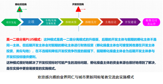 在笔者看来,传统开发商直接进入孵化阶段,亲自操盘,完全是一种资金错配、能力错配和周期错配,因此,运作不畅是必然的。现在,民营开发商大面积退出城市更新项目的前期孵化阶段,并不意味着市场化城市更新方向错了,而是一二级联动的城市更新市场化模式需要调整。城市更新网认为调整的方向不是让原民营开发商做的一二级联动调整成限定只能由国企来做一二级联动,更不是回归到政府征收做地的计划经济时代,应该是去发现和认识群众中的创新做法,并加以肯定和规范,比如城市更新网提出并正在实践的真一二级分离PLUS模式::