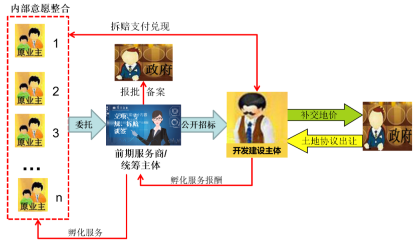 早在2013年,城市更新网就提出了由第三方充当原业主和开发商之间桥梁的城市更新项目孵化思路,如下图: