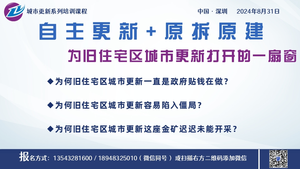 目前的中国经济,可以说到了改革开放以来最困难的时候。这个坎能否过去,在于是否能够坚持继续改革开放,坚持市场经济。中国的市场经济,在诞生之初,就打上了计划经济的烙印。1992年,要不是邓公南巡的一声断喝,中国的市场经济可能在1992年就掉头回归计划经济了。近十几年,改革开放进入深水区,市场经济也出现了回归计划经济的倾向。城市更新的市场化又何尝不是这样。2009年,以深圳、广州为代表的珠三角,开启了中国城市更新市场化探索。但随着开发商主导的一二级联动模式的弊端逐渐显现,再加上民营开发商的大量爆雷。中国城市更新市场化的探索,也开始出现回归行政化、计划经济的苗头。笔者始终认为,市场化道路出现了陡坡,并不意味着市场化的方向错了,恰恰意味着我们需要投入更新的精力,展现更大的智慧,把市场经济做向深入,而不是掉头回归。所有历史是人民创造的,唯有充分尊重人民的原创精神,真正尊重人民的主人翁地位,才能迈过市场化道路中出现的陡坡。城市更新的人民性,首先就体现在对原业主的充分尊重。自主更新,原拆原建,就是城市更新人民性的充分体现。而自主更新+原拆原建,可能就是破解城市更新市场化难题,而打开的另一扇窗户。城市更新网成立之初,就把为业主提供自主、自助的城市更新咨询服务作为己任,可以说,在自主更新+原拆原建道路上的探索,已经历了10年。2024年8月31日,城市更新网创始人宋留强,在深圳为您开讲自主更新+原拆原建的探索之路......。