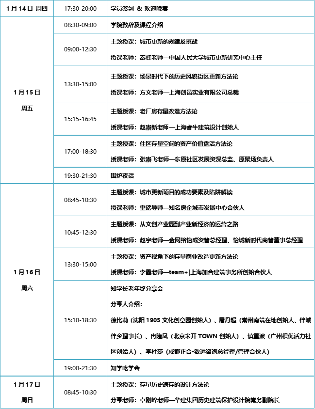 随着城市化进程步入新阶段,如何更好的落地和推进项目的进程,利用好“存量”和“增量”是关键,随着核心城市发展由外延式扩张向内涵式增长转变,城市更新成为常态,存量物业改造提升正转战成为运营型地产的主战场。1月15-17日,知学学院将组织国内拥有丰富实操经验的城市更新领域专家,聚焦城市更新不同类型项目,如老城复兴(历史文化街区&社区更新)、老厂房改造、存量商业活化、住区内容赋能和TOD模式等,围绕城市更新项目“规律趋势、成功要素、陷阱解读、改造设计、功能重塑、运营提升、投资逻辑”,展开项目全生命周期的难点和痛点研讨。